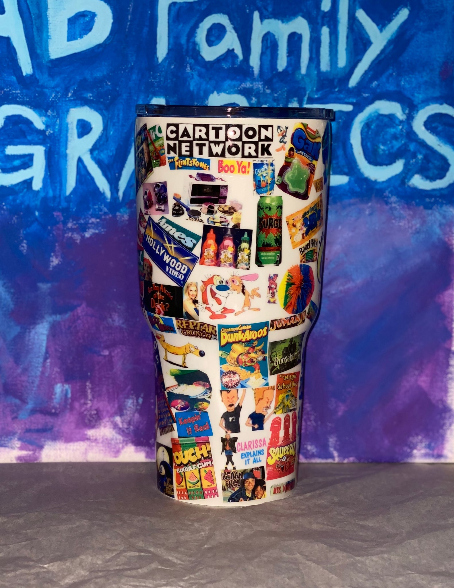 90's themed tumbler with the most 90's things we could think of and fit. There are over 100 individually placed decals on this cup. With this painted white background, this stainless steel tumbler cup will keep any drink hot or cold for hours and has all our favorite quotes and images. Feel free to message us with any customizations or changes you would like to make to the cup.