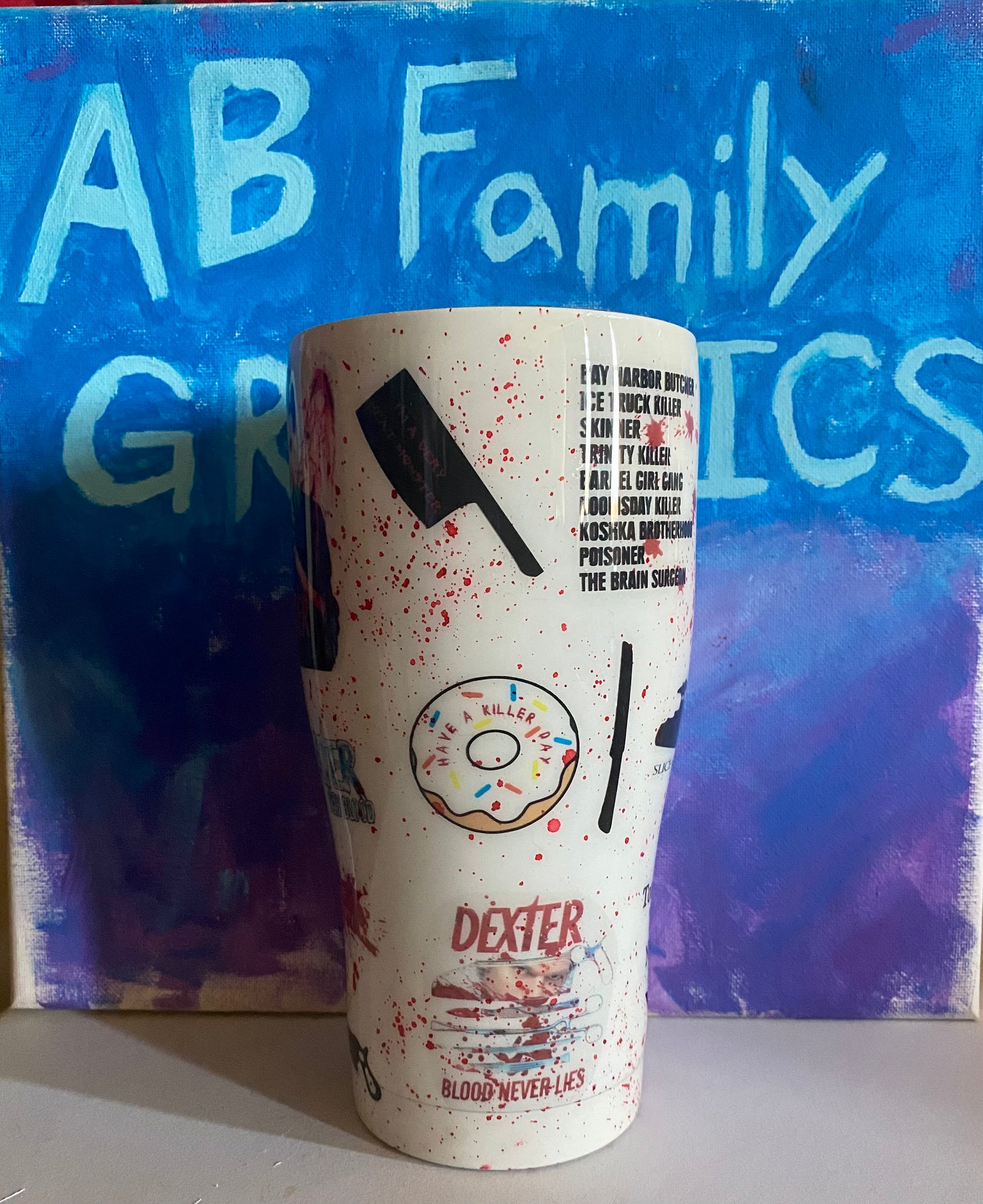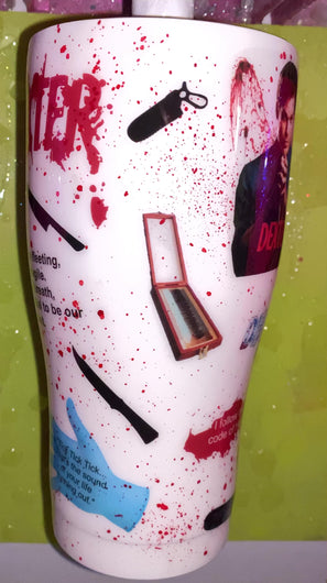 Dexter themed tumbler. With our signature blood spatter, this stainless steel tumbler cup will keep any drink hot or cold for hours and has all our favorite quotes and images. Feel free to message us with any customizations or changes you would like to make to the cup.