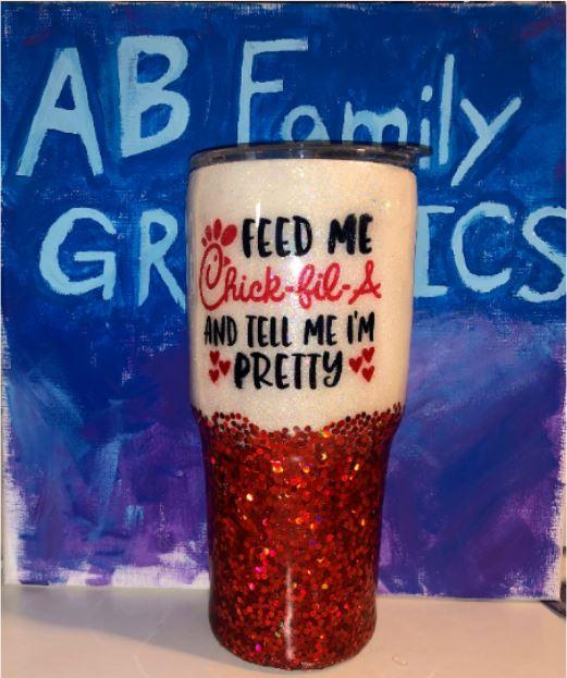 This cup features a decal "Feed me Chic-fil-a and tell me I'm pretty," it has a two tone feel with white glitter at the top and a mix or red chunky and fine glitter at the bottom. This stainless steel tumbler cup will keep any drink hot or cold for hours. Feel free to message us with any customizations or changes you would like to make to the cup.